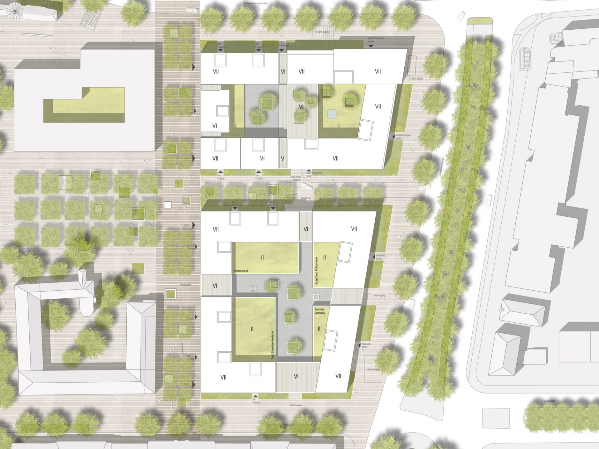 Intensiv begrünte und bewusst gestaltete Dachbereiche über den flächigen, kulturellen Nutzungen können als Freibereiche für die Wohnungen genutzt werden. Die Größe des vorgeschlagenen Blocks ermöglicht die Schaffung einer hellen und offenen, jedoch auch entsprechend intimen Atmosphäre für Wohnen und Kultur.