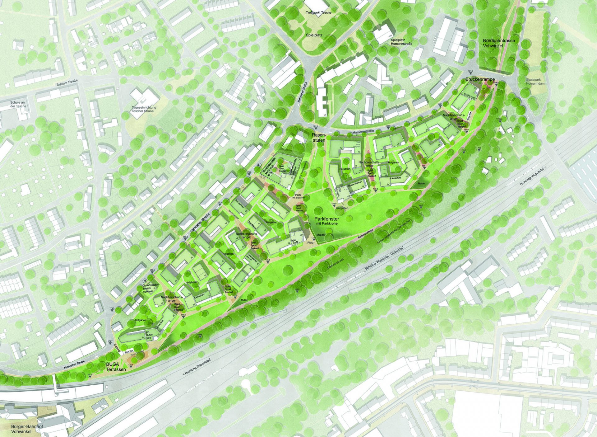 Alle Gebäude sind über grüne Nachbarschaftsanger mit dem Park verbunden, der sich über die Geländemodulation zum „Parkfenster“ weitet. Die „Parkkrone“ – drei markante Hochpunkte – wird zum zentralen Treffpunkt mit überregionaler Ausstrahlung. Die Erschließung wird gestaffelt.