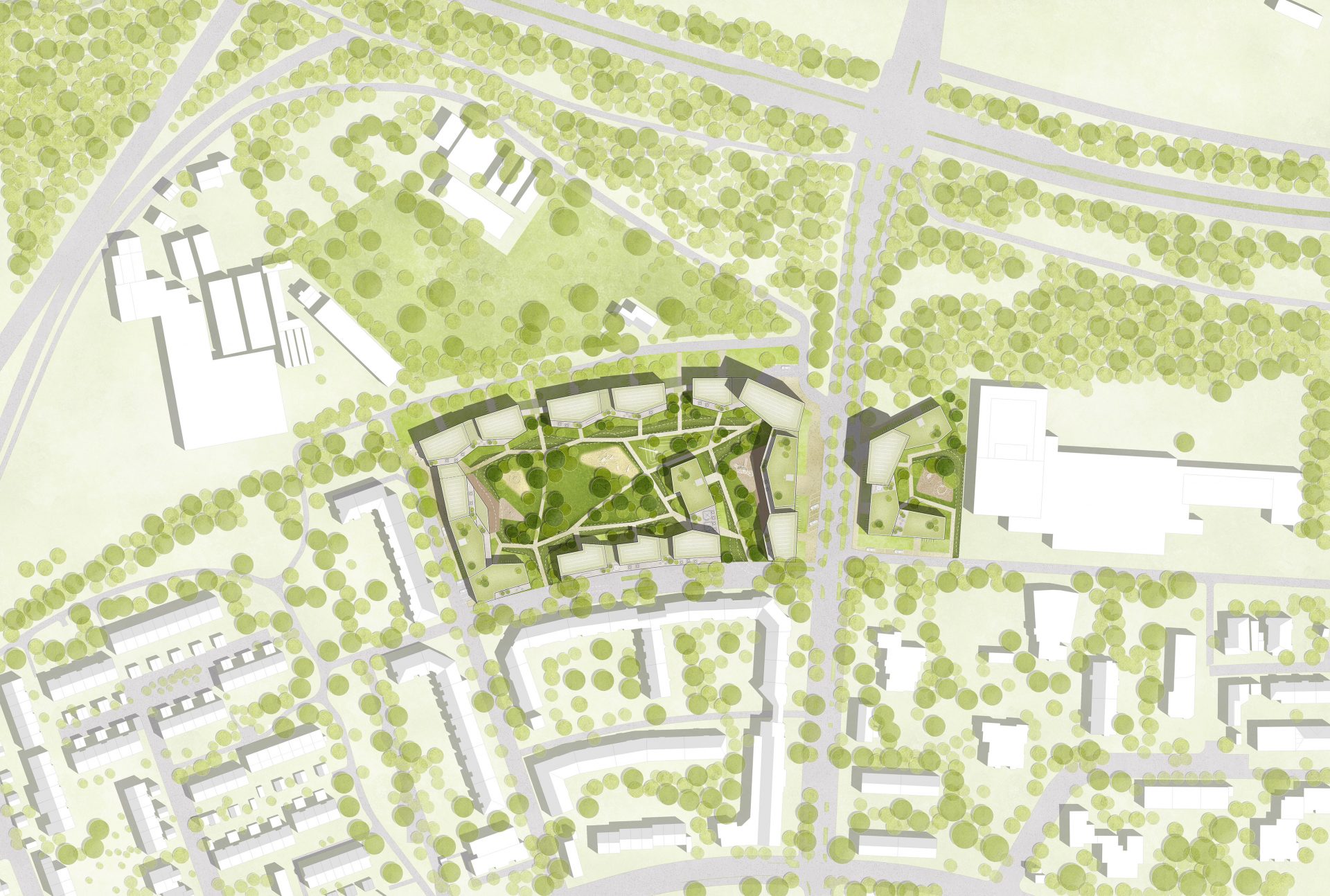 Der Wohnpark erhält einen attraktiven Außenraum. Die dominierende Feuerwehrzufahrt wird zukünftig in Schotterrasen ausgebildet, so dass die große befestigte Zufahrt entfallen kann. Die Randbereiche erhalten durch den Arkadengang eine räumliche Fassung. Bunt blühende Beete und Rabatten säumen den Rundweg. Sitzbänke laden zum Verweilen ein.