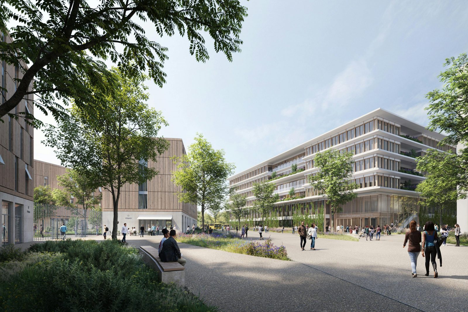 Bei unserem Entwurf haben wir auf weitestgehenden Erhalt der Bäume Wert gelegt. Zusammen mit den Neupflanzungen von klimaresilienten Baum- und Straucharten wird das Ankunftszentrum in eine abwechslungsreiche grüne Landschaft eingebettet. Alle Dachflächen sind mindestens als leicht intensives Retentionsdach vorgesehen und werden zusätzlich mit PV-Modulen versehen.