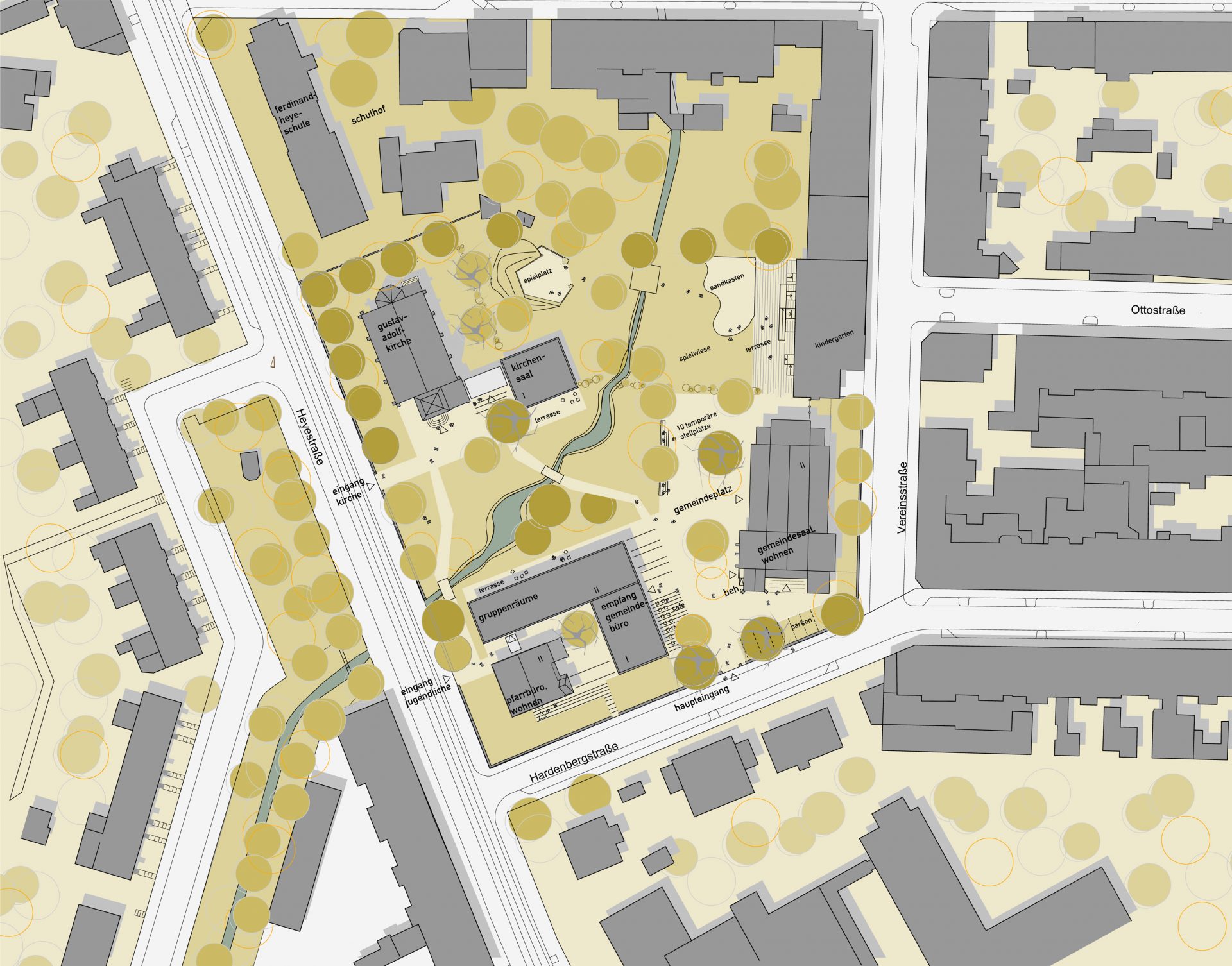Ziel der Außenanlagengestaltung ist es, ein offenes und einladendes Bild der Kirchengemeinde zu schaffen. Dafür wird der Bereich zwischen den Grundstücksrändern (Einfriedung) und den Gebäuden als großzügig begrünte Fläche beibehalten und in Teilbereichen ergänzt. Der dichte Strauchbewuchs wird entfernt, um Ein- und Ausblicke zu ermöglichen. Die Lindenreihe an der Kirche wird ausgelichtet und nach Süden ergänzt, um die Kirche zur Straße hin sichtbar zu machen. Der vorhandene, wertvolle Baumbestand wird weitestgehend in die Planung integriert.