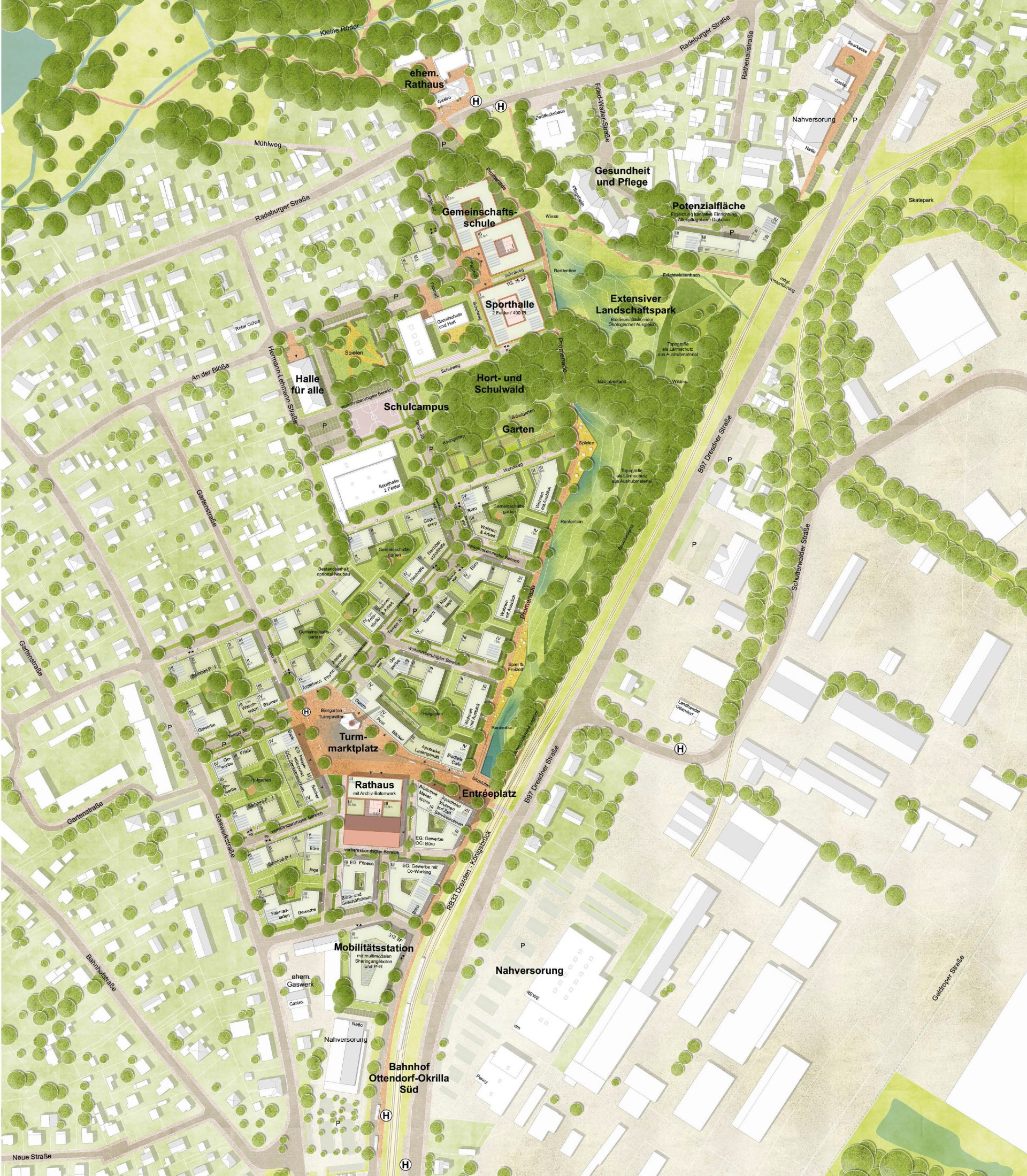 Die Neue Ortsmitte wird als identitätsstiftendes, urbanes Quartier konzipiert, das dem strukturlosen Zentrum Ottendorf-Okrillas endlich ein Herz gibt. Das städtebauliche Leitbild basiert auf der Transformation der Industriebrache in ein kompaktes gemischt genutztes, klimaangepasstes Quartier mit besonderem architektonischem Ausdruck. Der Ort soll für alle Generationen einladend sein, Gemeinschaft fördern und die Vergangenheit mit der Zukunft verbinden – durch Neuinterpretation des Ortsbildes unter Einbezug ausgewählter Bestandselemente des Betonwerks.