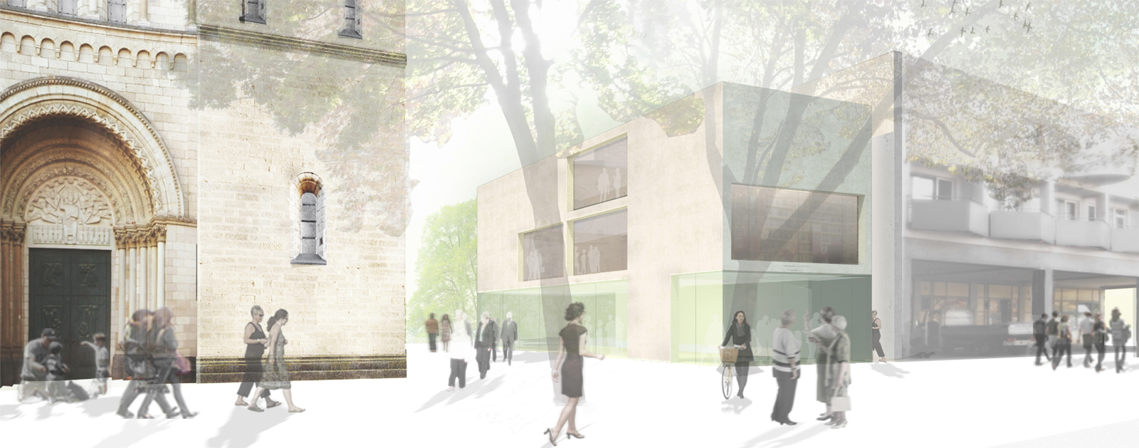 Durch den großen verbindenden Raum zwischen dem neuen Pfarrzentrum und St. Heribert wird ein bedeutender städtischer Platz mit einer ganz eigenen, neuen Aufenthaltsqualität und Aura geschaffen. Hier öffnet sich die Kirche.