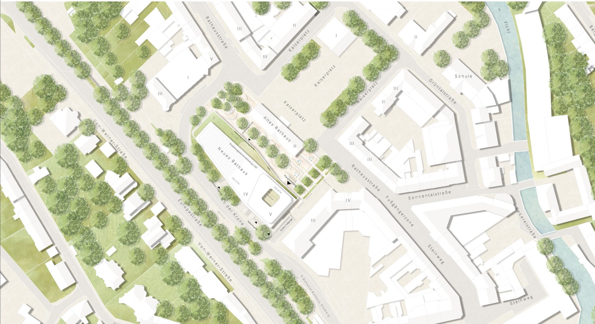 Fußläufig erfolgt die Haupterschließung vom Kaiserplatz direkt zum historischen Rathaus mit dem Standesamt sowie über den neu gestalteten Platz östlich des Altbaus zum zentralen Haupteingang des Neubaus. Ein weiterer Erschließungsweg führt vom S-Bahnhof über die Straße „An der Krone“ zum Nebeneingang des Neubaus. Zusätzliche Querungen im Westen binden das Quartier auf kurzen Wegen an.