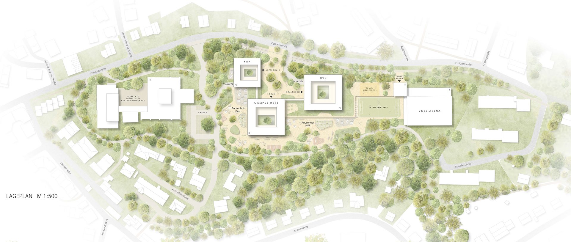 Das neue Schulgelände am Mühlenberg wird als nachhaltiger, zukunftsweisender Lern- und Arbeitsort gestaltet. Das Konzept vereint Gemeinschaft, Nachhaltigkeit und Klimaschutz durch eine, klimaresiliente und nutzungsfreundliche Freiraumgestaltung.