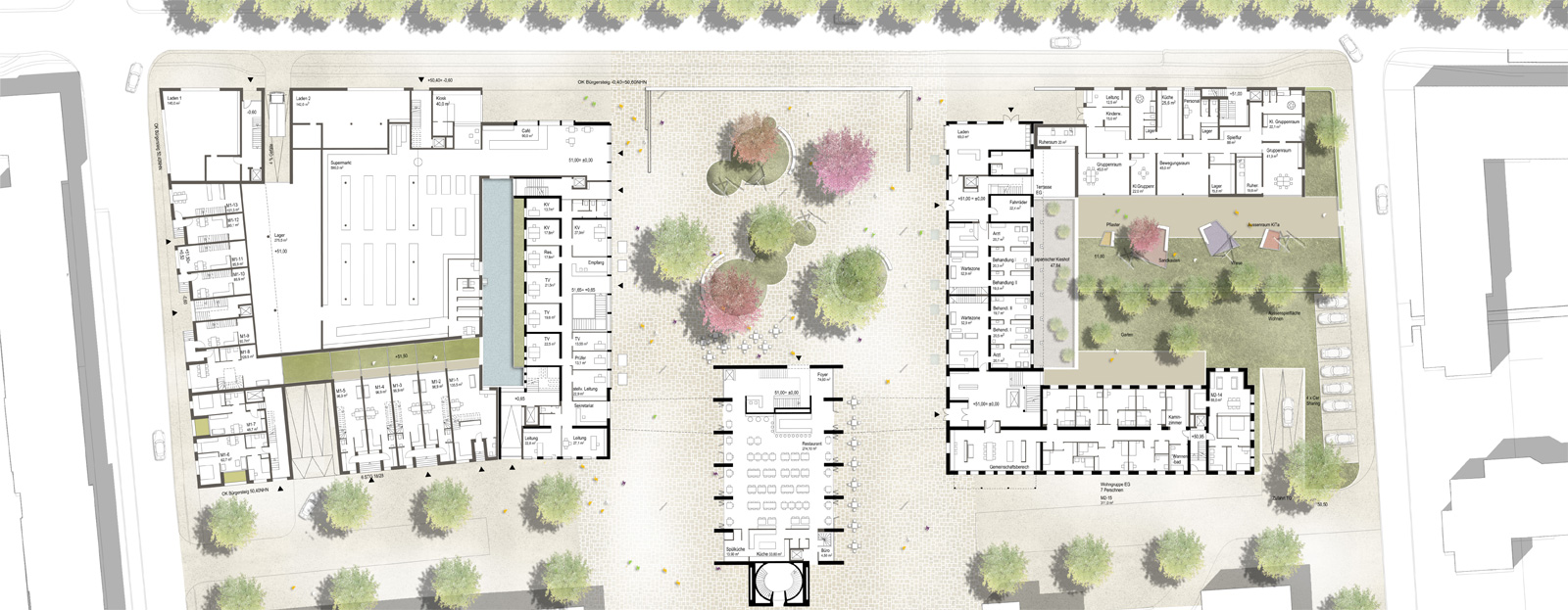 Vielfältige Nutzungen gruppieren sich um einen Platz und ein altes Kirchengebäude.