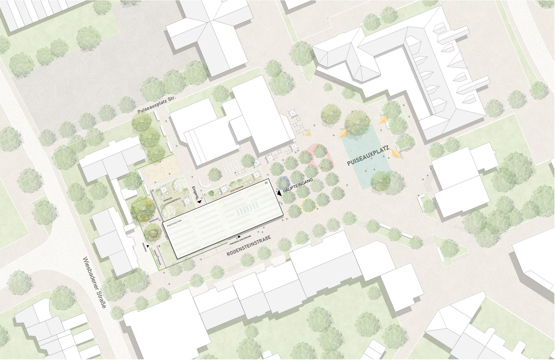 Der Platanenhain bleibt in seiner Gesamtheit erhalten und bildet mit dem vorgelagerten Vorplatz einen grünen, identitätsstiftenden Freiraum. Eine Reihe der Platanen wird zugunsten der Präsenz des Neubaus am Platz und dem Abstand Richtung Westen nach Osten versetzt.