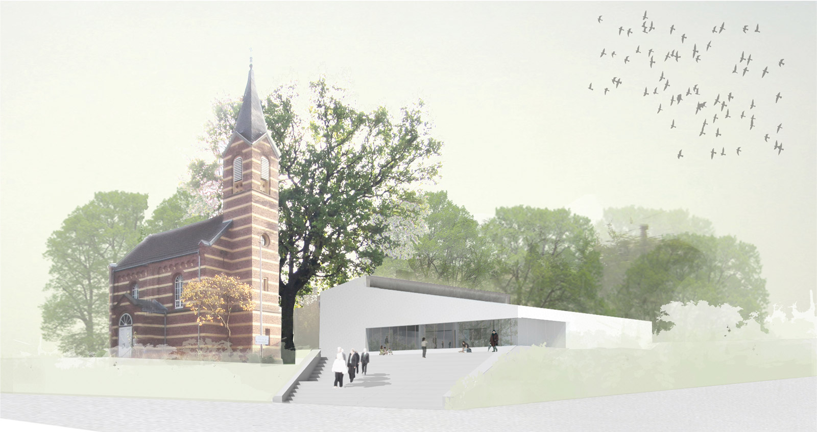 Um das neue Gemeindezentrum als öffentliches Haus im Bewusstsein der Bürger präsent zu machen, wird der Besucher durch eine große Treppe empfangen, die ihn auf einen erhöht liegenden Gemeindeplatz führt. Dieser Platz bildet, mit der alten Eiche als wesentliches Merkmal, das Zentrum der Gemeindearbeit.