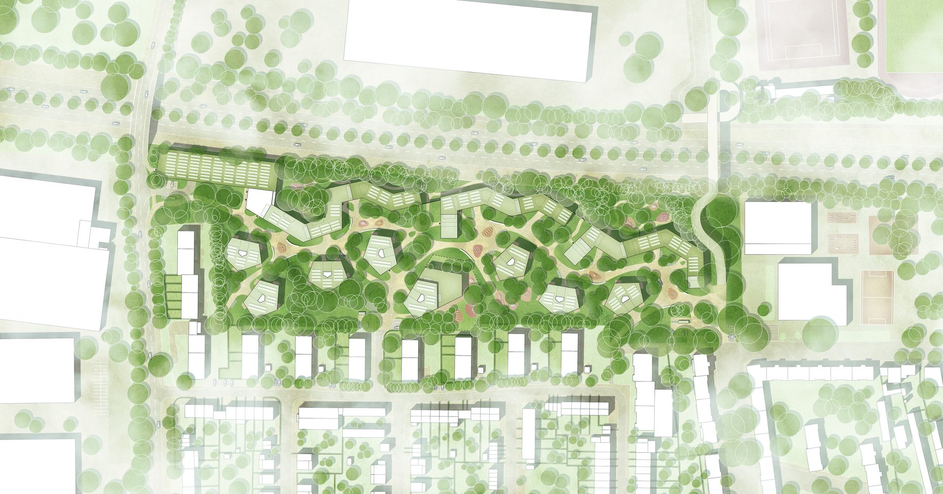 Das Grundstück ist sowohl an den Rändern wie auch auf der Fläche stark begrünt und mit zahlreichen Baumbeständen ausgestattet. Im Fokus der Neuplanung steht daher u.a. die Integration von Frei- und Grünflächen sowie der verantwortungsvolle Umgang mit dem vorhandenen und weiter zu entwickelndem Baumbestand.