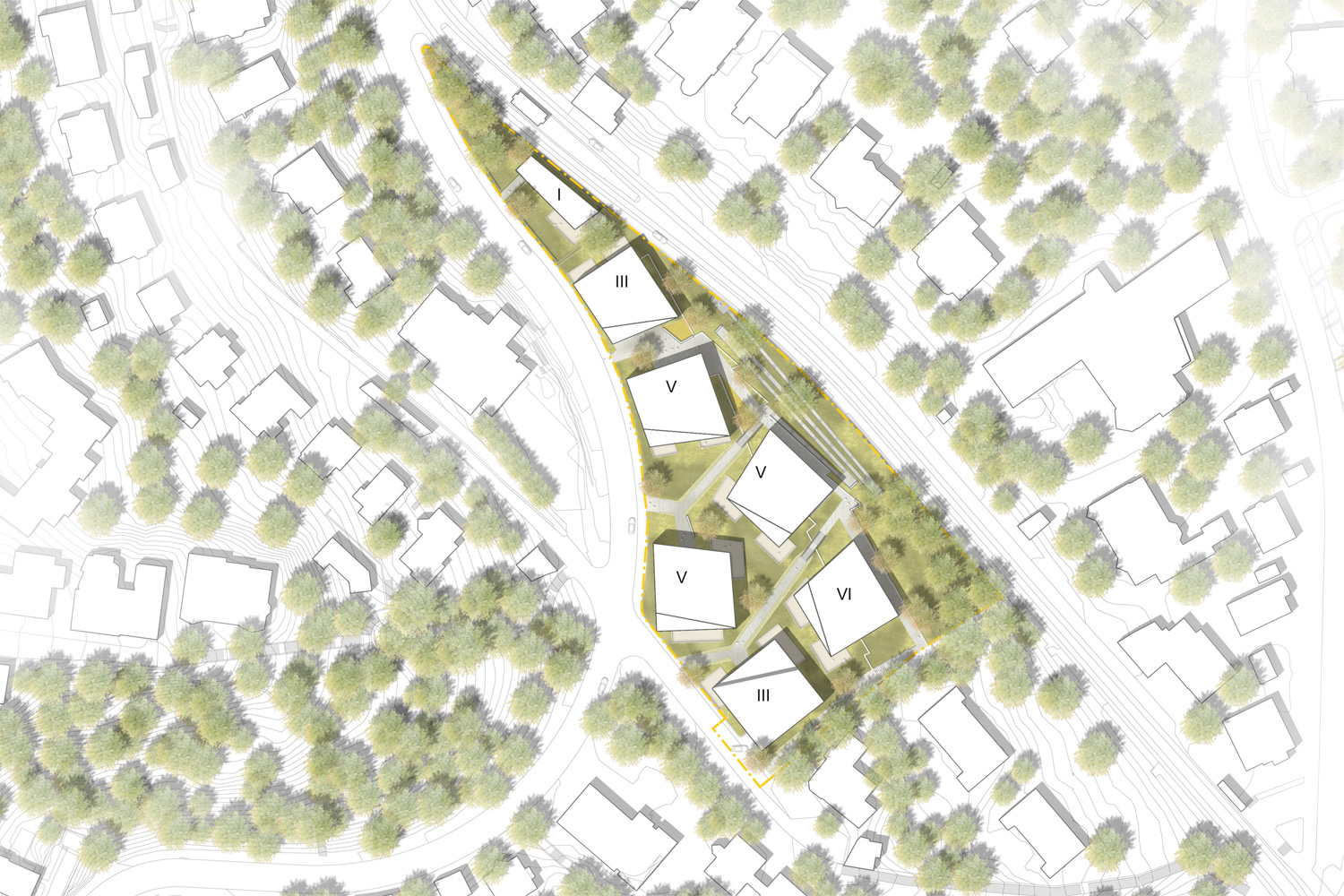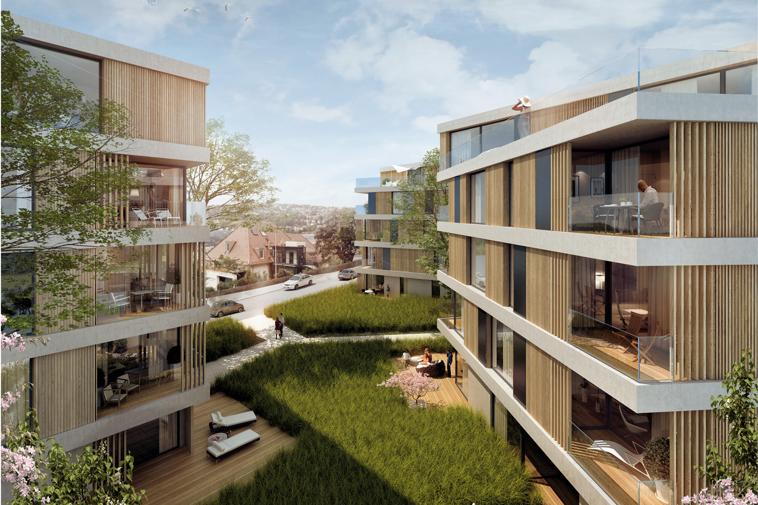 Ein Gräsermeer aus Lampenputzergras und Chinaschilf prägt den gesamten Freiraum. Eingebettet in dieser Landschaft liegen auf zwei Ebenen die Erschließungswege. Eine steile Treppenstiege verbindet die höher liegende Straße mit dem Grundstück. Die großzügig bemessen Terrassen liegen in diesem Gräsermeer und schaffen so private Freiräume. Als zusätzlicher Rhythmus werden Sumpfeichen gepflanzt. Zusammen mit den Ähren der Gräser und der Herbstfärbung in gelb, orange und Rottönen der Eichen entsteht eine abwechslungsreiche Stadtlandschaft.
