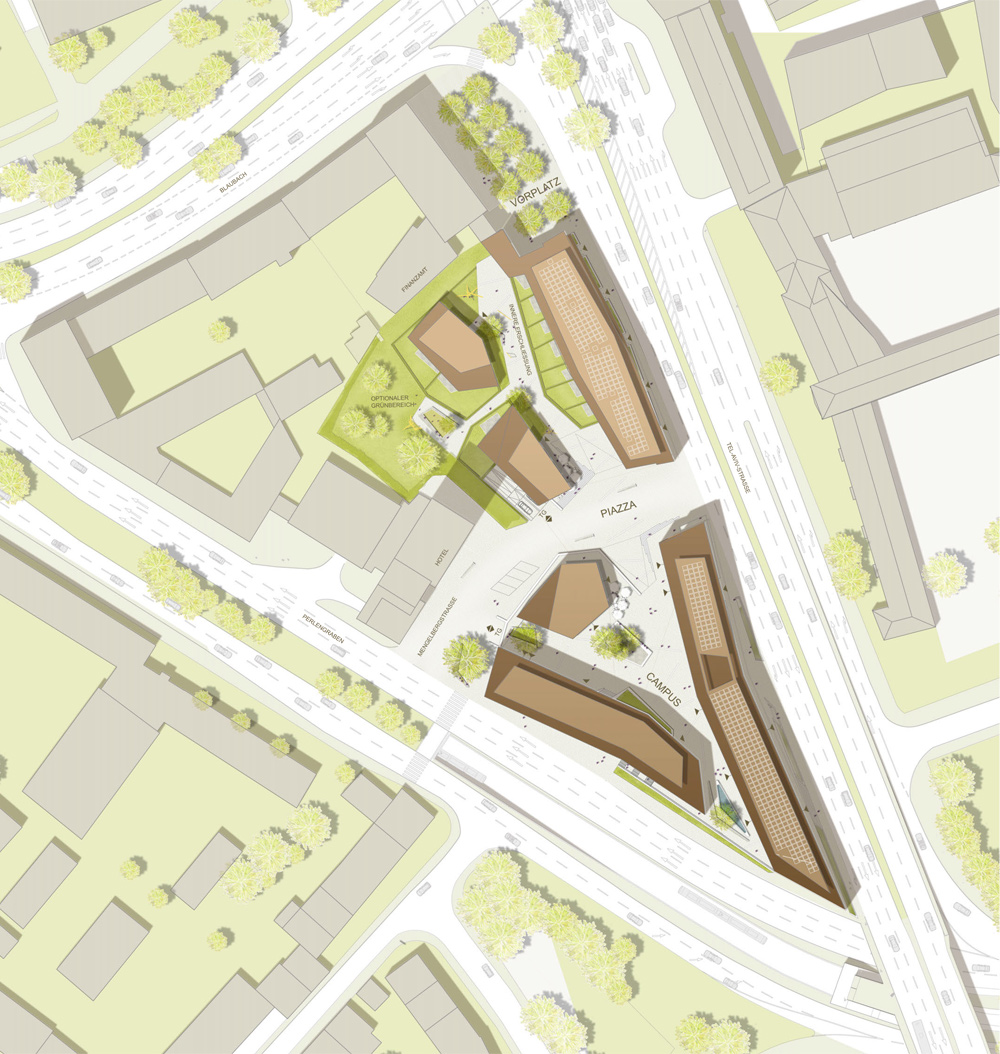 Gezielt platzierte Grünelemente in Sichtachsen prägen den Campusbereich, eine begrünte Wand als hängender Garten bildet zum Perlengraben den Blockrandabschluss. Die Erdgeschosszone zum Perlengraben beeinhaltet einen Supermarkt mit Zugang im Mündungsbereich Perlengraben / Mengelbergstrasse mit Stellplätze in der Tiefgarage.