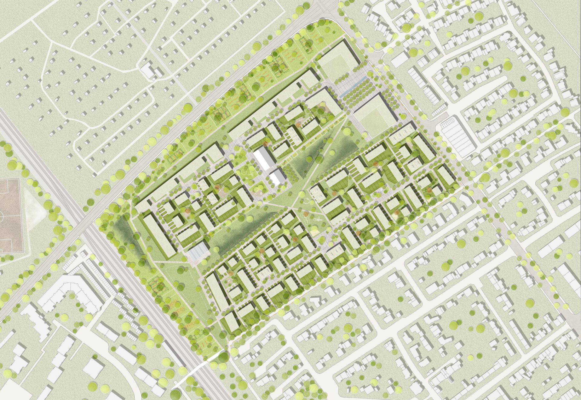 Über autofreie und kurze Wege wegen die Wohnquartiere angebunden. Großzügige Wegeachsen verbinden den Freiraum miteinander. Entlang der Nordseite bieten Kleingärten zusätzliche Anbauflächen für Bewohner*innen aus den Obergeschossen. Mittelpunkt ist der große Spiel- und Aufenthaltsbereich in der Mitte.