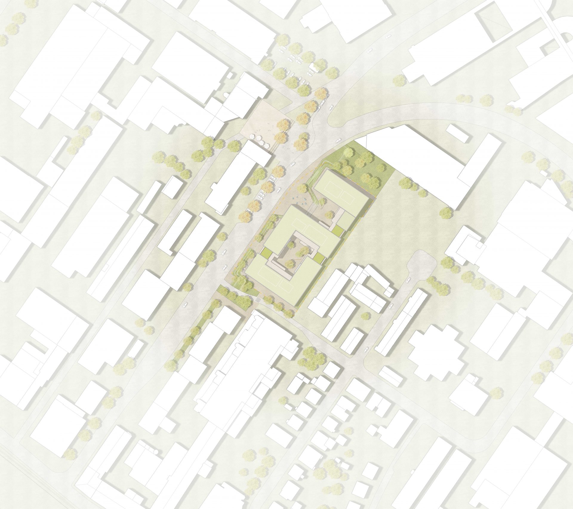 Die ‚grüne Bühne‘ und die Freitreppe verbinden die beiden (halböffentlichen) Höfe mit dem Stadtraum. Während sich der Eingangshof zur Sieglestraße öffnet, ist der zweite Hof eher introvertiert und bietet in Kombination mit der Cafeteria einen attraktiven Aufenthaltsraum im Freien. Die Innenhöfe laden zum Verweilen ein, mit Sitzbereichen in den Randbereichen der Höfe und Baumpflanzungen (Laubbäume), die Schatten spenden und für angenehme Temperaturen an sonnigen Tagen.