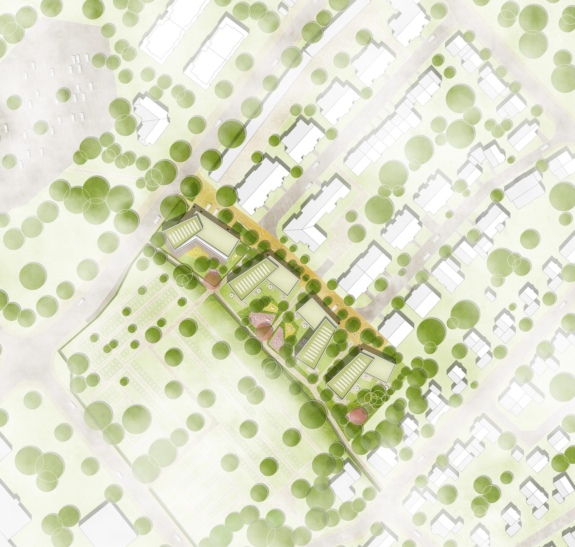 Im rückwärtigen Bereich des Plangebiets werden der Außenraum der Kindertagesstätte, private Gärten und Kleinkinderspielflächen in die Gestaltung der Hofbereiche integriert, um eine familienfreundliche Umgebung zu schaffen. Fußläufige Verbindungswege im Süden und zwischen den Häusern stellen eine direkte Verbindung zu den angrenzenden Quartieren her.