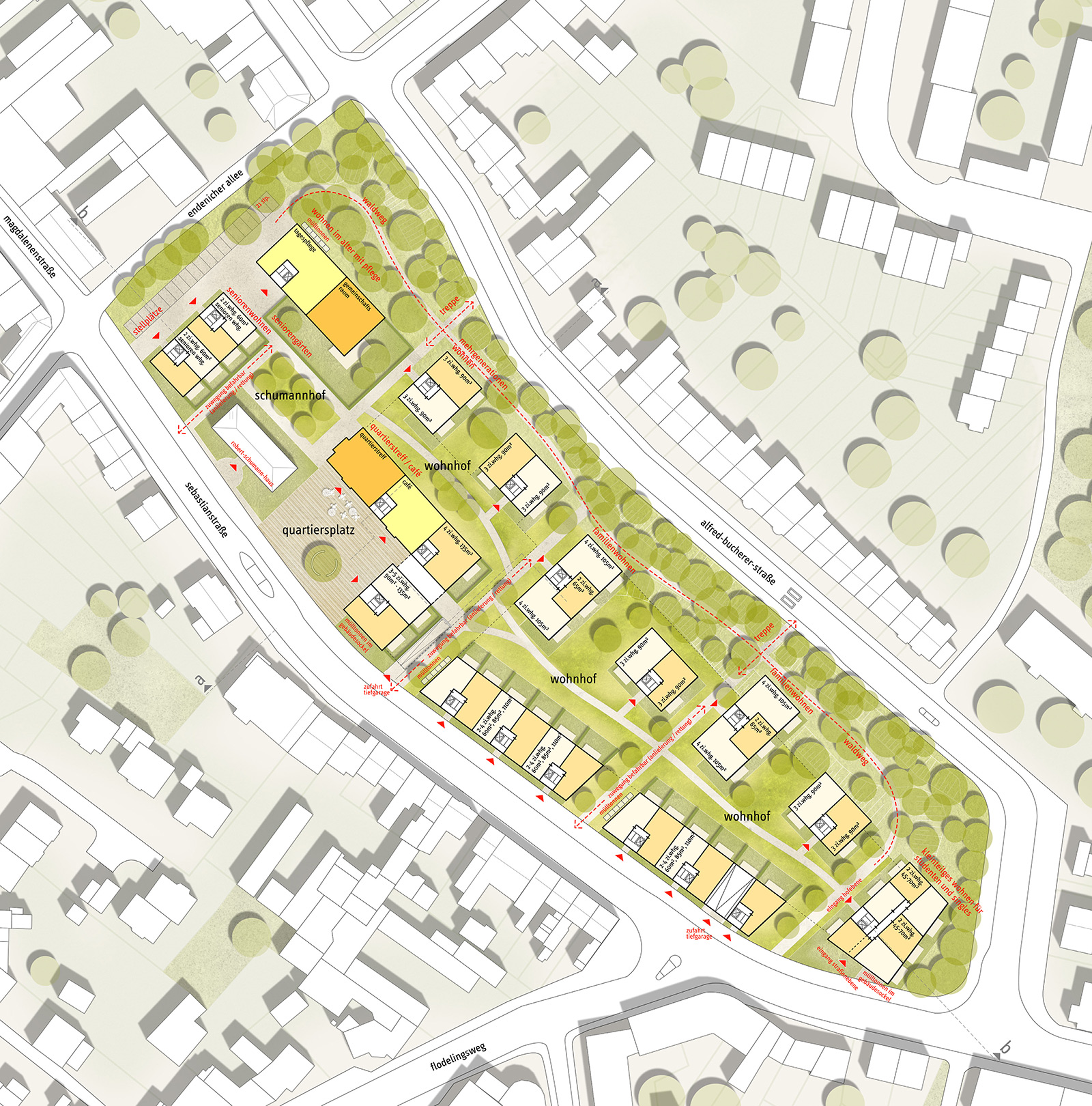 Den Ausgangspunkt des städtebaulichen Entwurfes bildet der neue Quartiersplatz. Das daran gelegene Ensemble aus Robert-Schumann-Haus und Quartierstreff im ehemaligen Paulusheim stärkt die historische und kulturelle Bedeutung des Ortes, dient der Adressbildung, und unterstützt die Entwicklung vielfältiger Aktivitäten auf dem Areal.