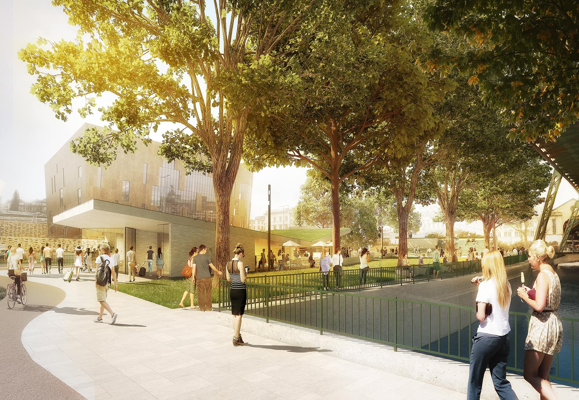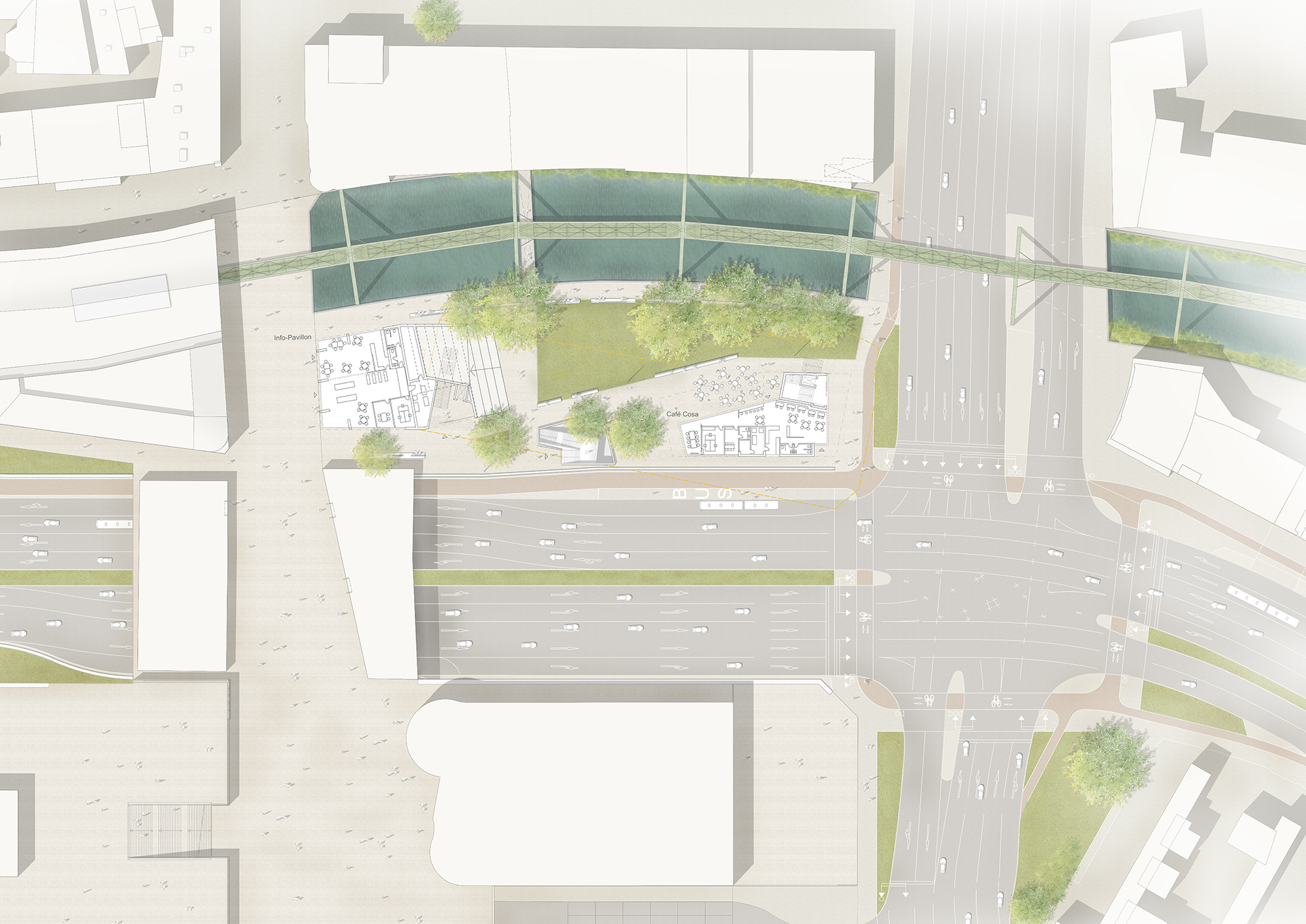 Beide Pavillons liegen an städtebaulich prominenten Lagen an den Hauptstraßen und begrenzen so den Park. Zwischen den Gebäuden liegt der Zentrale Haupteingang zum Tiefbunker. Entlang der Wupper und der Bundesallee werden verbindende Wegeachsen angelegt. Im Inneren des Parks entsteht durch die Anordnung der Gebäude ein räumlich spannender Ort. Prägnantes Element sind dabei die Rasensitzstufen auf dem Infopavillon mit der vorgelagerten, bühnenartigen Platzaufweitung.