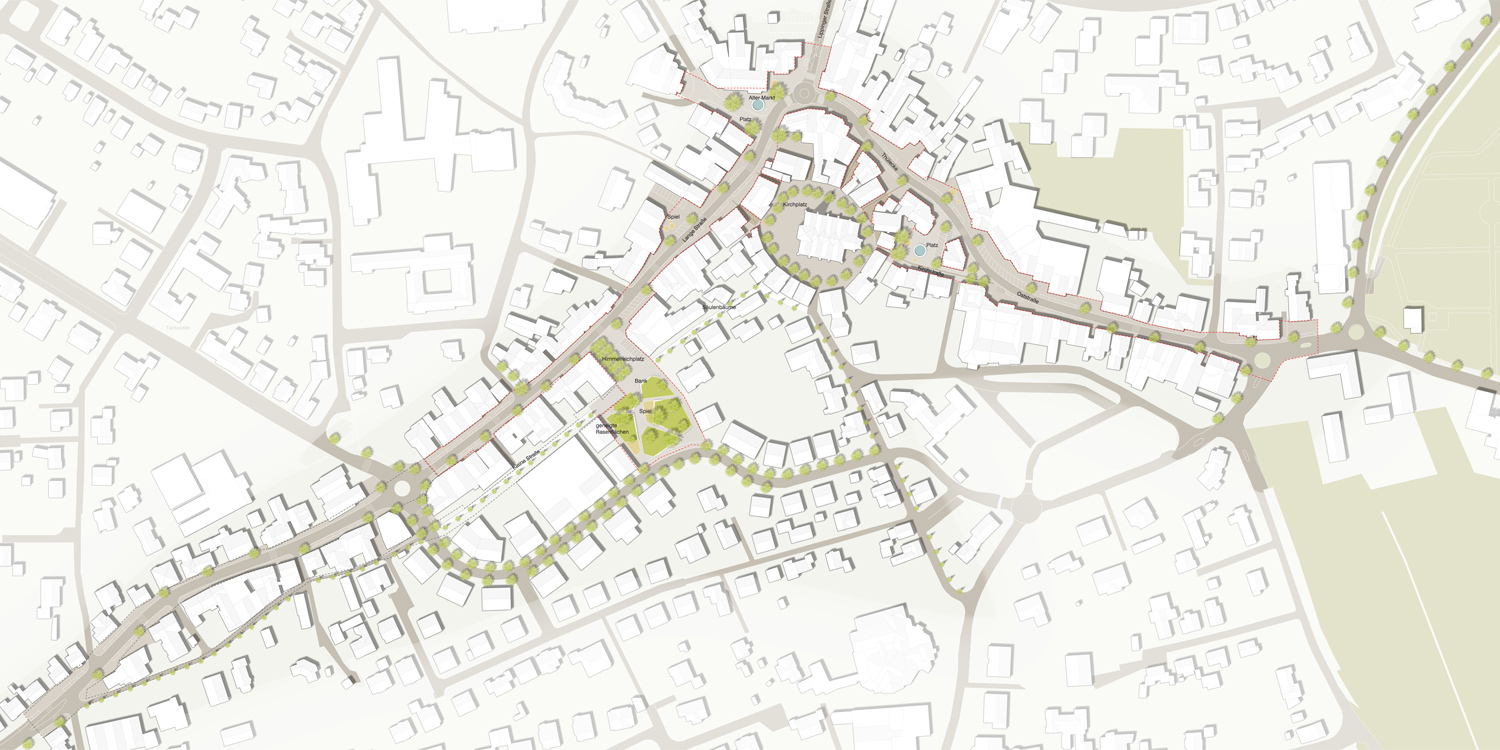 Innerhalb des Entwurfsbereichs sollen einzelne Orte „eigener Identität“ gestaltet werden. Hier rücken insbesondere die bestehenden Plätze wie der Alte Markt und der Kirchplatz, aber auch neu gewonnener Raum wie an der Volksbank, vor der Thülecke, der Oststraße und der Himmelreichsplatz in den Fokus. Besondere Spiel- und Sitzgelegenheiten, sowie ein besonderer Platzbaum schaffen Identität und Aufenthaltsqualität. Die Fahrbahn soll im Hinblick auf eine Verkehrsberuhigung verschmälert werden, einseitig gesetzte Straßenbäume bilden eine klare Linie entlang der Straße.